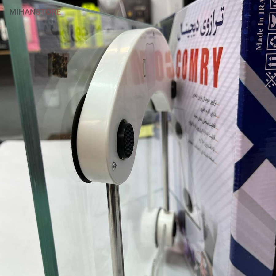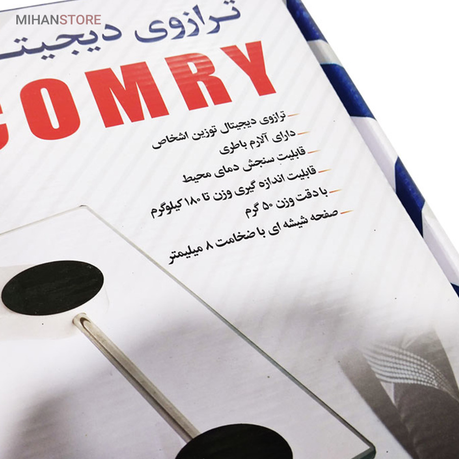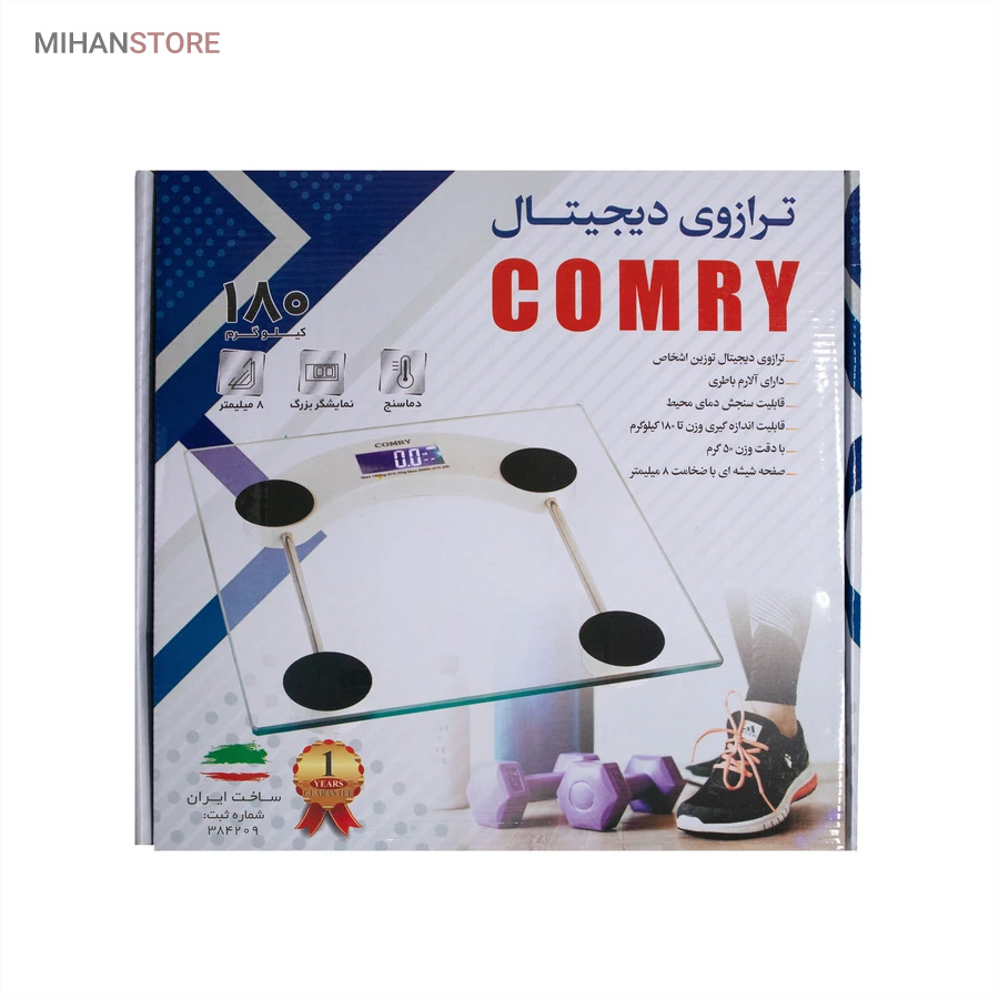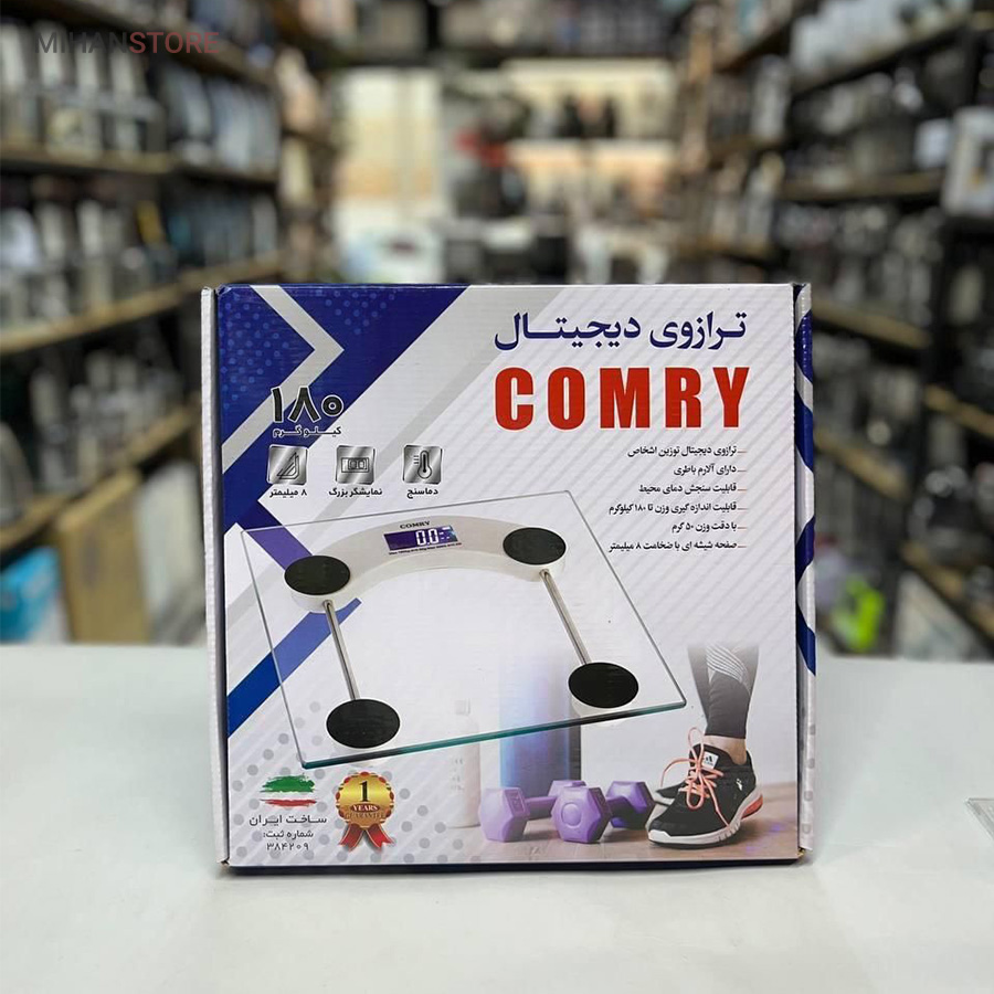 ترازو دیجیتال کومری شفاف از شیشه نشکن با ضخامت ۸ میلی‌متر ساخته شده‌است. این ترازو دارای ظاهری ساده و مینیمال است و بر روی آن نمایشگر ال‌ای‌دی تعبیه شده و وزن شما را کاملا خوانا نمایش می‌دهد. چهار دایره مشکی رنگ بر روی بدنه شیشه‌ای بی‌رنگ این ابزار، ظاهر آن را از یک‌نواختی خارج کرده‌است.  این ترازو از نوع جدید ترازو وزن کشی کومری هست که نسبت به سایر ترازو ها در بازار از دقت بسیار بالایی برخوردار هست.